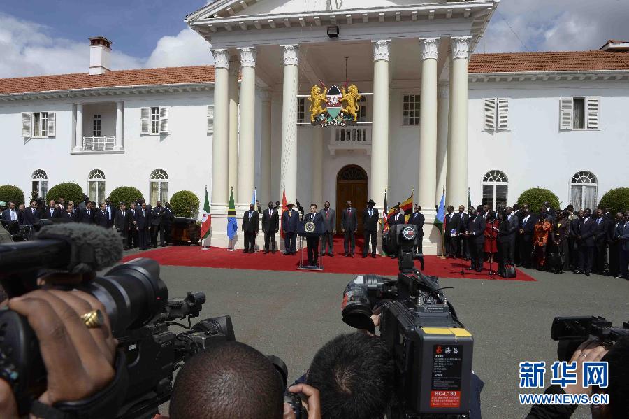 5月11日,中國(guó)國(guó)務(wù)院總理李克強(qiáng)在內(nèi)羅畢國(guó)家宮與肯尼亞總統(tǒng)肯雅塔共同會(huì)見記者,介紹中非合作建設(shè)肯尼亞蒙巴薩-內(nèi)羅畢鐵路情況。烏干達(dá)總統(tǒng)穆塞韋尼、盧旺達(dá)總統(tǒng)卡加梅、南蘇丹總統(tǒng)基爾等東非地區(qū)國(guó)家領(lǐng)導(dǎo)人參加。新華社記者 李學(xué)仁 攝