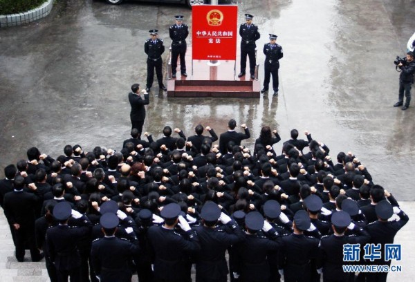 11月24日,重慶市云陽(yáng)縣人民法院的干警面向《憲法》宣誓。當(dāng)日,重慶市云陽(yáng)縣人民法院舉辦紀(jì)念設(shè)立“國(guó)家憲法日”主題實(shí)踐活動(dòng),全院160多名干警面向《憲法》莊嚴(yán)宣誓,并在“弘揚(yáng)《憲法》民主精神,履行使命公正司法”條幅上簽名。十二屆全國(guó)人大常委會(huì)第十一次會(huì)議于11月1日審議通過(guò)了關(guān)于設(shè)立國(guó)家憲法日的決定,明確將12月4日設(shè)立為國(guó)家憲法日,國(guó)家通過(guò)多種形式開(kāi)展憲法宣傳教育活動(dòng)。新華社發(fā)(覃輝 攝)