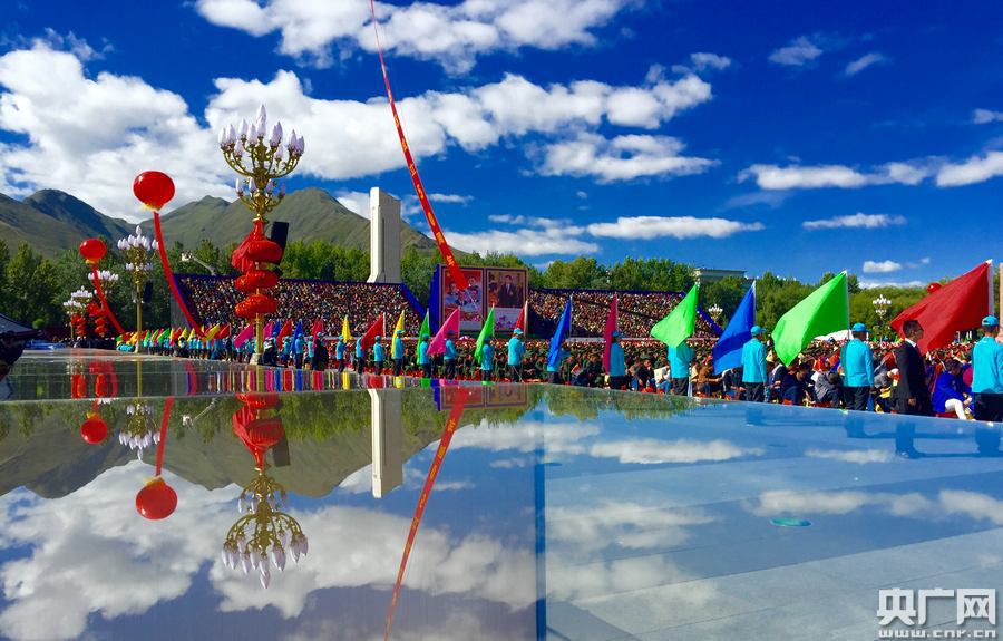 央廣網拉薩9月8日消息 今年是西藏自治區成立50周年。今天上午10時,西藏自治區成立50周年慶祝大會將在拉薩市布達拉宮廣場舉行。圖為慶祝大會現場(央廣網 張瞳/攝)