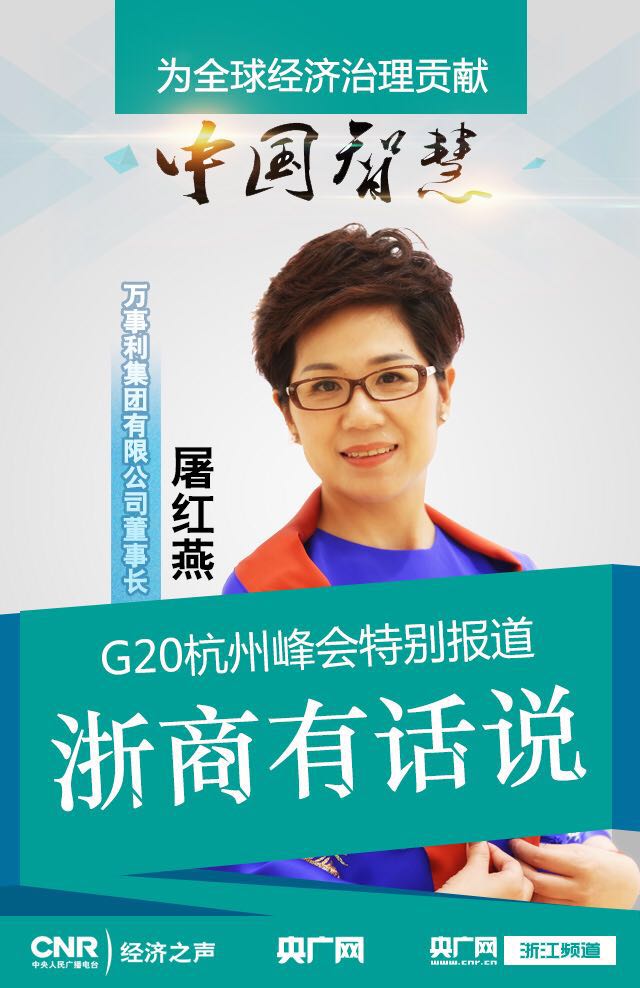 央廣網(wǎng)北京8月31日消息 G20峰會將于9月4號到5號在浙江杭州舉辦,這是中國首次主辦G20峰會。今年峰會的主題為“構(gòu)建創(chuàng)新、活力、聯(lián)動、包容的世界經(jīng)濟”。作為成員國GDP占全球經(jīng)濟90%以上的國際經(jīng)濟合作論壇,G20在全球經(jīng)濟治理領(lǐng)域中發(fā)揮著越來越重要的作用。在G20峰會之前,經(jīng)濟之聲特別策劃《浙商有話說》專訪萬事利集團董事長屠紅燕,暢談她對G20、對未來發(fā)展的思考和構(gòu)想。